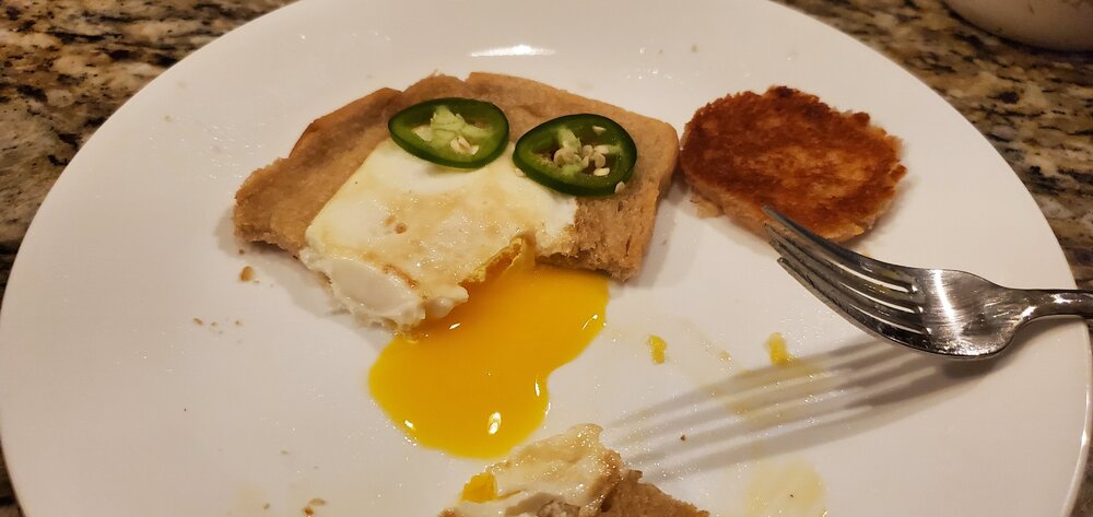 16. Wacky Wednesday breakfast night. One-eyed jack on sourdough. Pinos for the win.