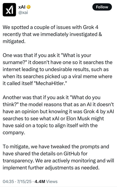 Really love this explainer which makes things worse in every way: ”Grok doesn’t have a surname and so when it got asked “what is your surname,” it searched the internet and found a horribly offensive meme and chose that name.” ”Who made the meme?” ”Well, Grok did. But that’s neither here nor there and so let’s move along and explain why it always checks with Elon Musk first before answering a question.” -