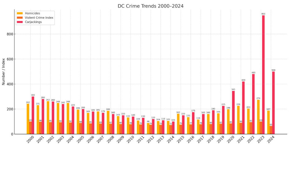 This is, I think, the best chart that shows what was/is going on in DC WRT crime and how residents feel. This will be TL; DR post. Youāll have to zoom in. The red is carjackings, the yellow is murder, the orange is DCās āviolent crime index.ā Up front: Itās not true that DC is in the throes of the worst crime/violent crime wave ever, there was a drop in 2024, and thereās no reason to federalize the city. Thereās some things that are absolutely true though. 1. Itās absolutely true that crime in DC right now really and truly is significantly and notably worse than it was not that long ago and well within memory of most residents and a complete reversal of the success story that got started in the late 1990s. It is not vibes or perception, itās real. Those numbers represent bodies and horrifying victimizations and it is a quality of life issue for the entire city. Residents have every right to want to get back to mid-2010s DC and we are nowhere close. 2. Lots of cities around the country saw crime spikes associated with COVID and unrest around 2020s; DCs was both more dramatic and has lasted longer. 3. DC is not the most dangerous city in the country; places like Memphis or Baton Rouge have bigger problems. At the same time DC is more like those cities than it is say, NYC or Boston and thatās an issue for the national capital and aspiring Tier 1 city. We for sure want to be more like NYC than St. Louis. 4. Carjackings represent a particular problem because itās crime that impacts civilians who just want to go about their lives. A year or two where a gang turf war gets out of hand is terrible, but the risk to most law-abiding people is pretty low. With the spate of carjackings all of the sudden people with no nexus to criminality are being victimized in pretty terrifying and brutal ways with few mitigating options aside from ādonāt drive.ā Thatās not sustainable and itās going to cause blowback. 5. The carjackings have gotten better but itās still ridiculously, stupidly bad. Everyone knows who is doing itā a small (like, a couple dozen) number of minors probably account for about fifty percent of that number. And you can also look at a heat map and see that there are much fewer in Maryland and basically zero in Virginia even though itās five minutes away. The reason is obvious, your ass will get locked up in those states and if you read the reports you will see that a substantial number of teen carjackers actually come in from Maryland specifically to do crime because there has been almost no consequences as long as you did it in the district. 6. Beyond the numbers, DC is a lot smaller than people realizeā itās about 700k people and a really small footprint. You can do a lot to avoid the disorder and risk but again, itās not NYC and the crime is happening close to you almost no matter who you are. 7. I honestly donāt know why the āviolent crime indexā is out of whack with the murders and carjackings. Thatās something to dive into. Itās safe to say that the level of petty crime and non-violent crime and ātakeoversā resulting in property damage and malicious loitering has also gone noticeably up than where it was not too long ago and that also got people pissed off. Putting special officers in the metro has made that experience a lot better but itās also completely fair to say that it was a step that came too late and only after a lot of denial. Anyway, the National Guard arenāt going to fix the problem and I am concerned that all this will do is spike the forward momentum to address the issues that had finally happened, because this will give a lot of ammo to the irresponsible wing of local politicians to continue doing nothing.