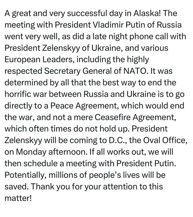 Early returns on Alaska are: not much. The vibes from Trump were cranky, sullen. The delegation didnāt eat together, no questions at the press conference. Heās distancing himself from it, putting the ball back in Zelenskyyās court. Heās clearly tired with this whole thing and wants a way out and will likely end up lashing out at Ukraine since they are the ones who will respond in some way. -