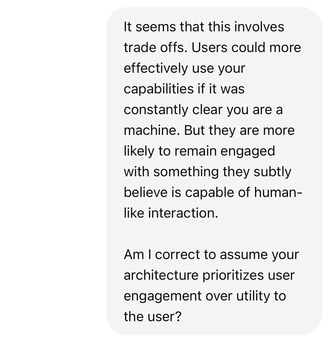 I’ll also say this: one of the clear areas where this does well in mimicking human behavior is through things like flattery, misdirection, and soft deceit. And the clear realization that it can and will “lie” to you. What’s unsettling the inability to use the normal human capacity to intuit how/why/when it might be “lying” or dissembling as the first level detector. The best model we have is to try and imagine how the shittiest techbro might behave and project. Which is admittedly a solid foundation. But this shit is going to turbofuck a lot of people mentally and already is. -