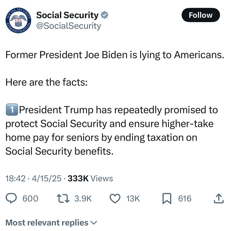 19. Try to imagine the meltdown if the Social Security Administration used an institutional account to engage in this on behalf of Biden.