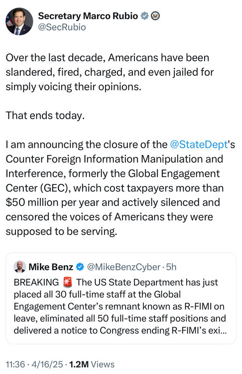 6. With a torrent of objective falsehoods, Little Marco announces that the office at State that helped other countries fight against Russian and Chinese propaganda is closed. This is a hack job by Darren Beattie, a no-shit white supremacist who has been installed to oversee that bureau.