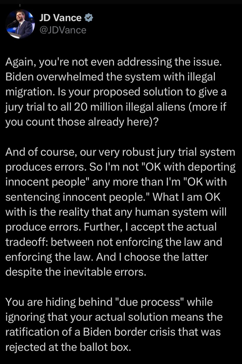 13. Vance creates a completely fictitious number (there are not more than 20 million illegal immigrants here) and uses the phrase “hiding behind due process.”