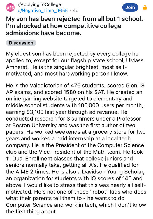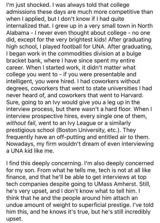 Relevant to this discussion, this Reddit thread got a lot of traction yesterday. You read through the thread and find out that his “other schools” are Ivies, UC system as out of state, Duke, etc. He had a fantastic fucking outcome! UMass-Amherst is a great school! If it’s your safety then you did well. A lot of this is parent’s grind-set bullshit. The dipshit is also telling on himself when he explains that his firm won’t even interview you if you aren’t an Ivy product.
