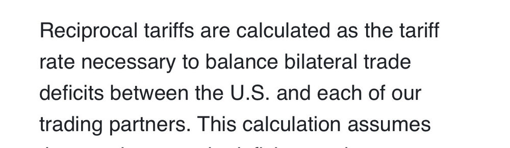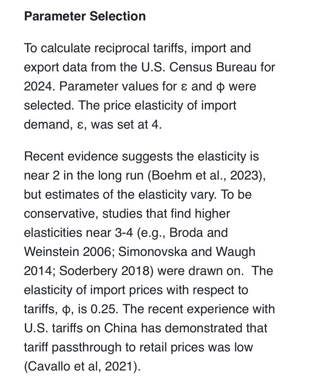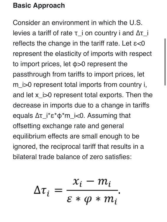 @ChickenSandwich , the USTR released the formula. It is Exports to US- Imports from US/Imports from US. Nothing to to do with VATS or tariffs at all, just a simple ratio reflecting a bilat trade deficit. They added some smart-sounding Econ terms and expressed them with Greek symbols to make this look complex and smart. They fixed the value of epsilon at 4 and the value of psi at .25, ensuring that they will cancel each other out. A laughable and transparent attempt to just make this simple formula look informed and analytical because they trust Americans won’t check and if they do, they’ll be too innumerate to replace the Greek symbols and do the simple task of multiplying an integer with its reciprocal and see that they just added some fucking chrome hubcaps onto their clapped out Altima equation. They are absolutely right.