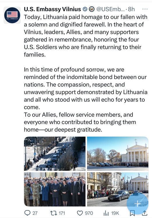 Last week four American soldiers in a NATO enhanced forward presence brigade accidentally drove an M-88 recovery vehicle into a deceptively deep Lithuanian marsh and drowned. They went missing for days; the Lithuanians and Poles spared no expense or effort to find their bodies. When asked about them, Trump was not aware it hd happened. Today their remains left Lithuania and this is how the Lithuanian people sent them on their final journey. These are the people who Hesgeth and Vance called pathetic. This is a nation who Trump invited Russia to “do whatever they want with.” They treat us very unfairly, looting, pillaging, raping our economy. We are liberated at last from Lithuanians. America is great nation. America earned leadership, loyalty, admiration, even love. But Americans— except for maybe these soldiers— are not worthy of this. We are not equal in generosity or bravery or kindness to Lithuanians. Or Poles. Or Ukrainians. We have squandered our inheritance and can only hope to be one day re-welcomed, undeservedly, to the table.- 1268 replies
