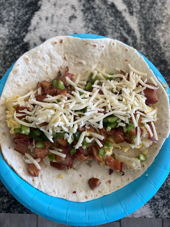 5. Scrambled eggs, chopped up bacon, green chili chicken sausage, potatoes, pepper jack cheese, fresh jalapeño