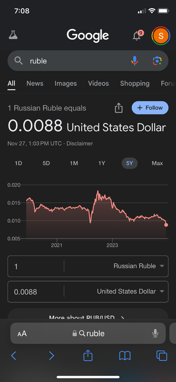5. The ruble stuff is worse than being reported. Everyone says “worst since March 2022”. Technically true but that was just a very transitory blip because of the start of the war. This is isn’t transitory. Mar 2022 is that short downward spike in the middle here.
