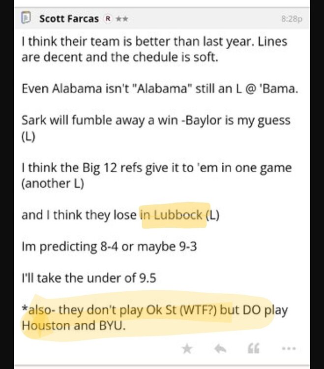14. So.... This rube checked the schedule to confirm we don't play okie lt this year but still has us taking an L in Lubbock? Idiot