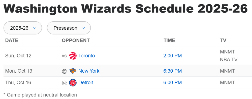 Washington's preseason schedule is weird. Looks like it kicks off a week later than most teams, and is fewer games. But anyways, here it is. Times are CST. Most cable packages offer NBA TV but you'll probably need League Pass for the other games.