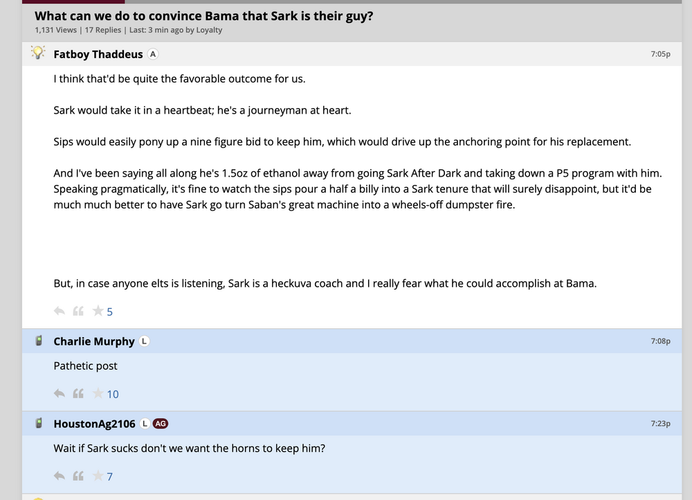 4. Aggies are still waiting for marching orders, struggling through sark sucks and we hope bama takes sark , also some dumbasses thinking bama wanted to hire herman