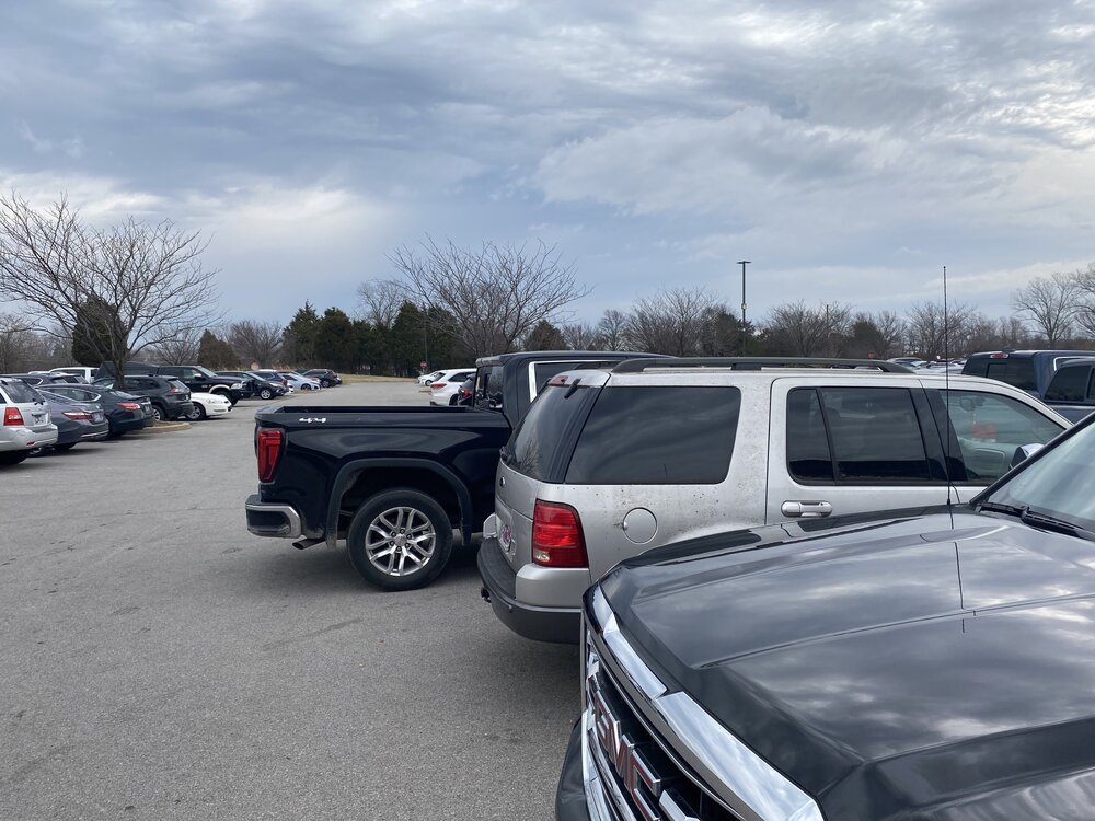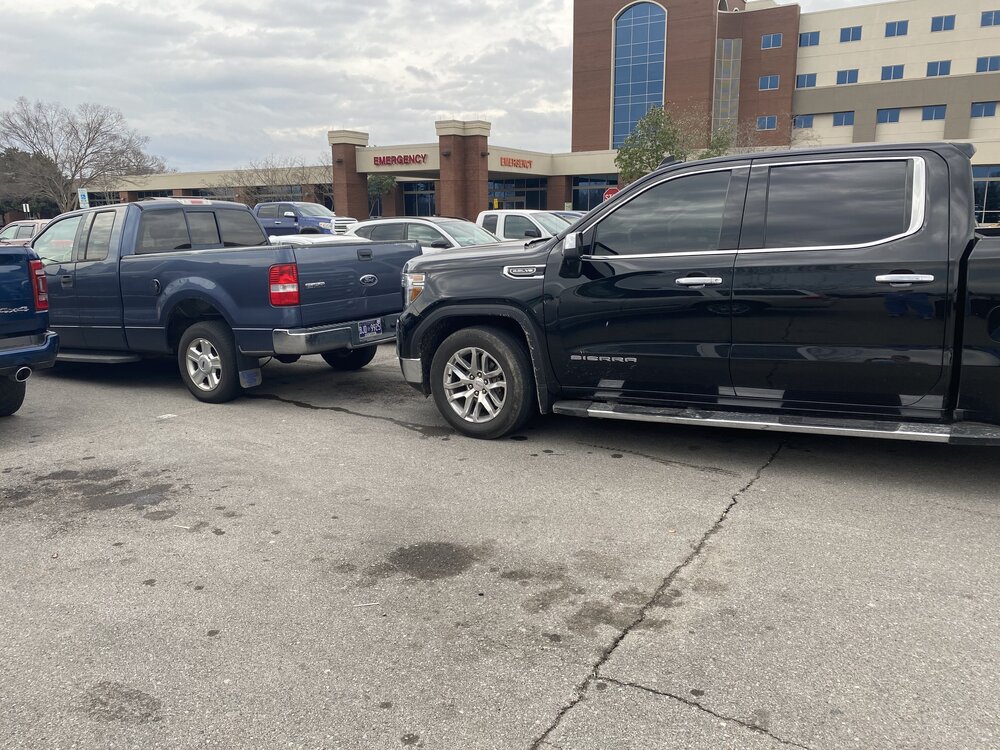 4. Who is the bigger douche? The blue Ford, who parked with his rear wheels on the line at the back of his space, or... the black GMC who chose to park in the spot behind him anyway?