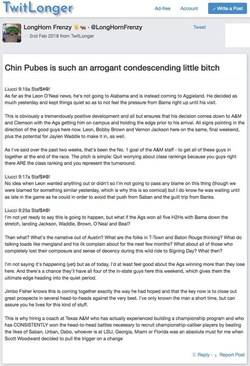 Now that we can close the books in the vaunted aggy 2018 recruiting class, let's reflect and take stock of how the dreams match up with the results. It's always funny when Billy Liucci bleats about others "losing their sense of decency." Because, you know, being part of a culture that places no value whatsoever on honesty or integrity defines decency.
