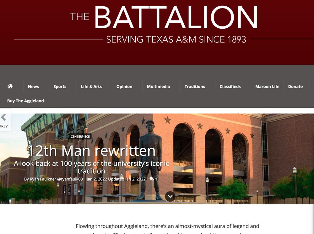 This story has been out for almost a week, and I'm still waiting for the any of the ags to acknowledge it exists. Exactly what I explained in 2013 (that their turdition is a fraud) has finally found its way to the A&M school paper. I haven't seen a copy of John Adams' book on the subject, but I eagerly await Adams' comments on this article. Which I know he is aware of, but will probably ignore until the day he dies. Shills do things like that. The silence out of aggyland on the substance of the Batt article is comical. https://www.thebatt.com/life-arts/12th-man-rewritten/article_8b1b8a32-5928-11ec-bf3c-8b8c15dc9b22.html