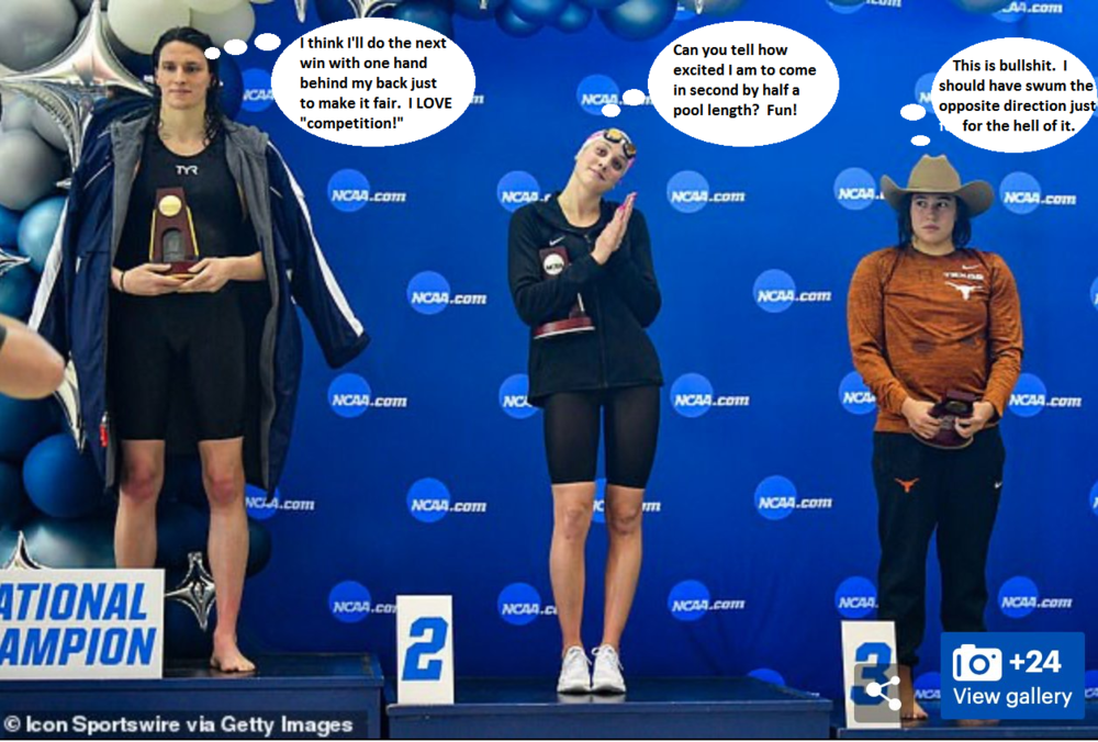 I watched the replay. For a bit a little closer than I thought, but after about 250Y Thomas was at least a body length or more in front, and widened the lead. It was over after the first 100 yards (shocker). The 500 is just above a sprint, so you'd certainly expect at least 2 swimmers to be neck/neck, and the winners within a body length of each other at most. Not even close, and of course completely expected for anyone who's followed this. Here's just before the finish - Thomas is in red circle, Emma Weyant (2nd) in blue, and Erica Sullivan (3rd) in yellow. As you can see, it was 1 1/2 body lengths at best. You also have to wonder how Weyant and Sullivan approached this, knowing they were absolutely going to get their clocks cleaned unless Thomas suffers a heart attack or something midway through. You have GOT to be "fuck this shit" to some degree. Neither of them sure looked very happy on the podium, did they? I don't think any reasonable person would say Thomas should never get the chance to compete for medals/championships, but it shouldn't be this. I suppose I don't think she should pull herself from competition - she can only swim in what's available. But anyone who thinks that this is anywhere near a fair thing should have their head examined. Someone had better figure this shit out or else it'll be a clown show.