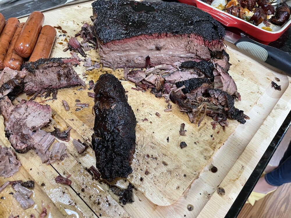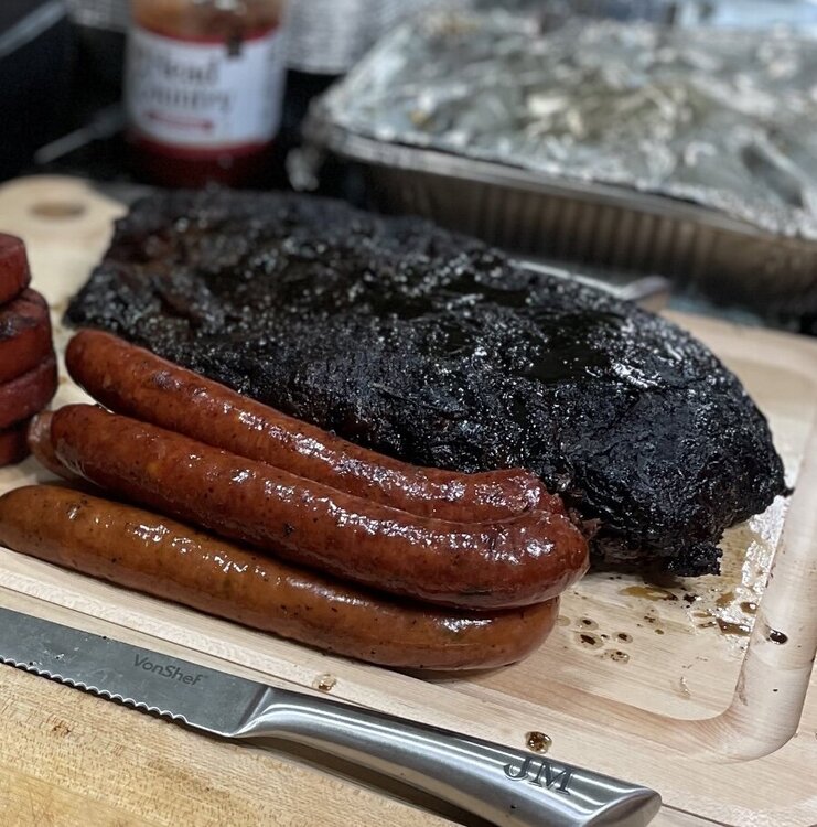 4. Smoked four briskets; pulled at 200-205 area; I only temped one. The other three I just felt around on (insert joke). They were wrapped in paper. I then took them off and wrapped them in plastic wrap. Put a towel in the bottom of the my cooler and up the walls; laid the four briskets in kind stair stepping them (trying to not smash the bottom one) ended up with three bath towels on top and shut the cooler at 10:30 at night; opened cooler the next morning at 8:30 and top brisket temped at 148. Results were good. I will do it that way moving forward. I'll post pics in a bit.