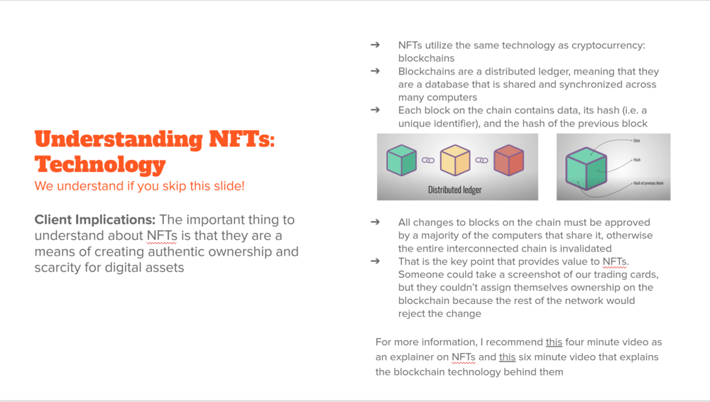 This is the slide from our proposal to players/agents that we use to explain NFTs. It's simplified but that's the gist of it.