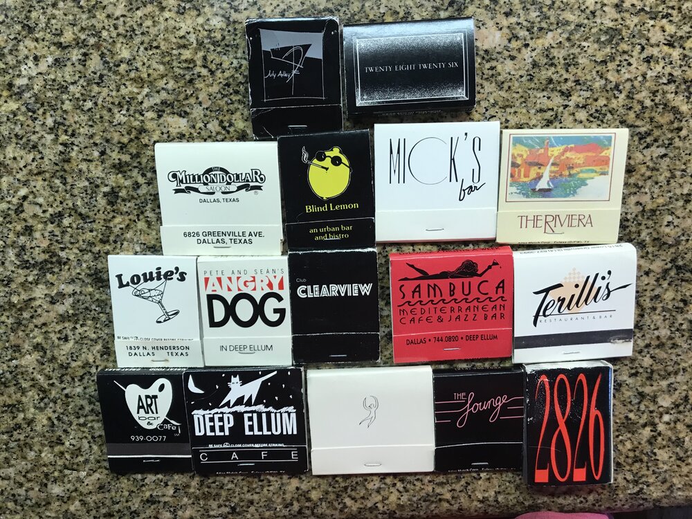 11. I feel fortunate to have experienced the Dallas Club Scene in the early 80’s to early 90’s during my college and post college party years. Early memories of Confettis, On the Air, Video Bar, Tangos (dancing frogs on the roof), and then the Starck Club came along and became arguably the most cutting edge and electic club that Dallas and all of Texas for that matter has ever had (I remember ecstasy was sold at the bar and the colorful characters that always hung out in the Bathroom lobby and the random crazy videos in the restrooms) Then Deep Ellum revived as I remember when it was only Club Dada and Club Clearview (I attended the initial keg parties In the original building that eventually evolved into Club Clearview after they got an official liquor license). Knox Street Pub (playing pool in back room), Stans Blue Note, Stoneleigh P, the ultra preppy Boardwalk Beach Club near SMU, 2826 in deep Ellum was rocking in the early 90’s during Texas OU weekend. Borrowed Money on Central and Cowboys on Garland Road for your urban cowboy “meat market” I know I’m missing many but it is a start photos below of Entrance to Starck Club and a few match boxes I collected over the years