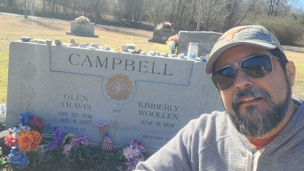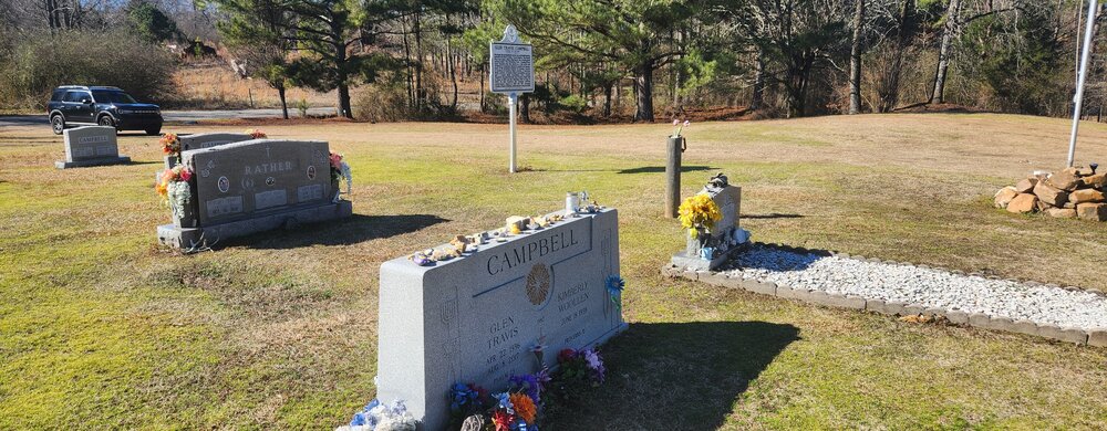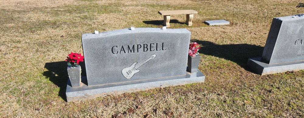 Dropped by and paid my respects to one of the greats. He's in Billstown, AR, where he was born, about an hour from the border in a family cemetery that's becoming more populated quite frequently these days. The cemetery is very well maintained and quite picturesque with a little pond off to the side. When you walk up to Glen's grave these is a motion sensor that trips and starts playing his version of Amazing Grace from a speaker mounted up in that large tree towards the back. I mean, come on. One of the other Campbells buried there had this emblazoned on the back of his headstone. I found it remarkable because as far as I know PRS hasn't invented the double-humbucker Stratocaster yet. I don't know which of He Stopped Loving Her Today or Wichita Lineman is the greatest Country song of all time, but it's one of those two.