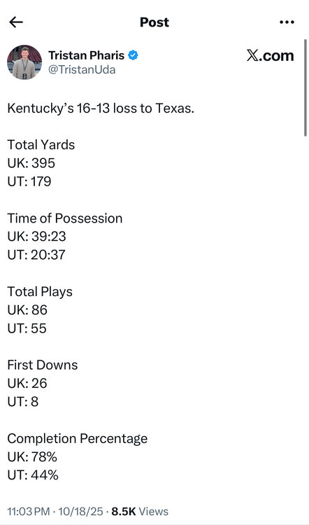 5. Ugly ass win. However, Kentucky fans are really friendly and humble in a loss. They all want Stoops fired. To a lot of their season ticket holders that was the last straw.