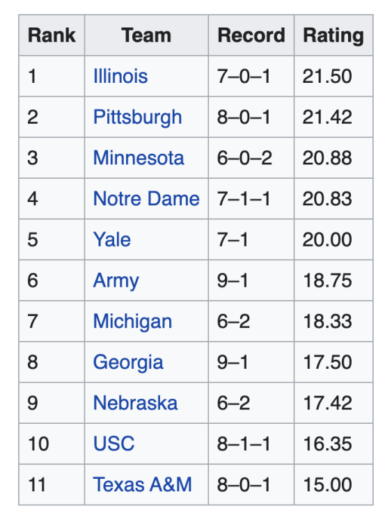 11. I am stumped. This site does not list it: https://www.ncaa.com/news/football/article/college-football-national-championship-history This site (looks like last updated in 1998) lists them but with no footnotes: http://www.aggieathletics.com/ViewArticle.dbml?DB_LANG=C&DB_OEM_ID=27300&SPSID=632660&SPID=93232&ATCLID=205238864 Even their wiki page says this (1922 should be 1927?): There was no contemporaneous system in 1927 for determining a national champion. However, Texas A&M was retroactively named as the national champion for 1922 by Jeff Sagarin. Most selectors have named either Illinois or Georgia as the 1927 national champion.[2] The team was ranked No. 11 in the nation in the Dickinson System ratings released in December 1927.[