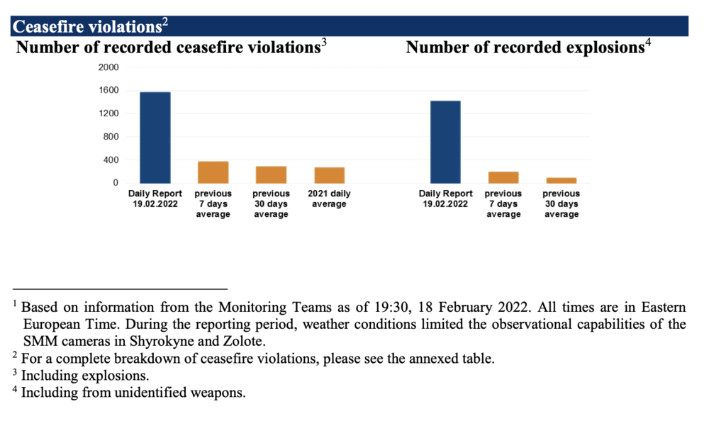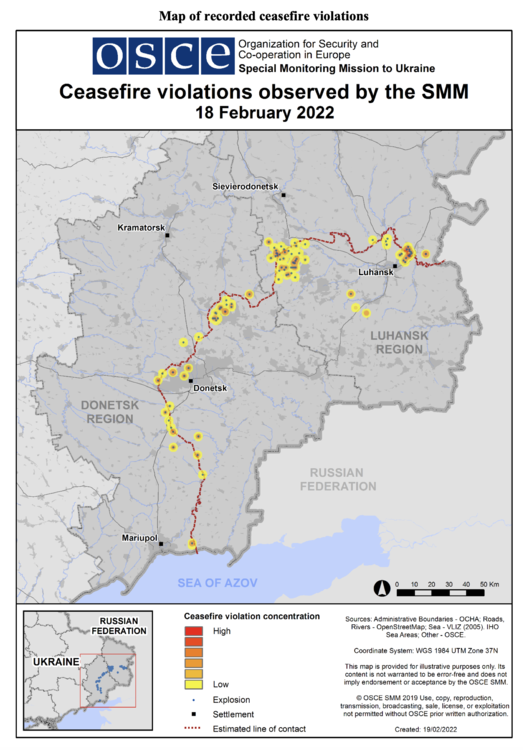 In case anyone is interested, the Organization for Security and Co-operation in Europe’s Mission to Ukraine is compiling daily reports of ceasefire violations, complete with a map and statistics, based on what their monitors are seeing. https://www.osce.org/ukraine-smm/reports The reports run a day or so behind, but it is showing where the activity is and I imagine it will be at least some type of resource to check in coming days. As resident Surly Jason Bourne aka @InkaUtexas has accurately stated before, OSCE isn't necessarily the most effective intergovernmental org. Here are the graphics of ceasefire violations and the map of incidents from the 18th.