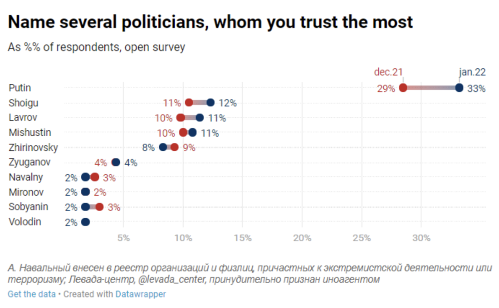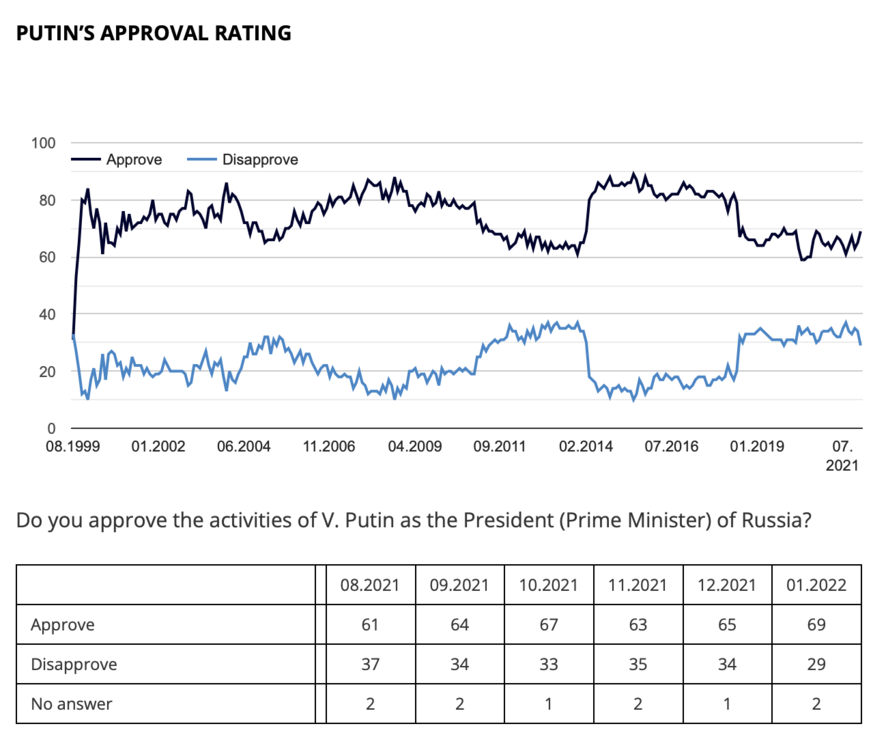 I have mentioned it before way upthread, but I have three direct reports in Moscow, all of whom are between 40 and 50, well-educated, well-connected, with plenty of years working abroad, including plenty of time in the West. They are the proto-typical Muscovites who are to a large degree open to western ideas and deeper European integration, and they regularly consume English-language media. And even with all that, all of them feel the exact same way as your co-worker. They definitely see Putin’s faults, and they don’t support him blindly on every issue, particularly when it comes to domestic issues. But when it comes to foreign affairs, they’ve got a real issue with NATO (and the U.S. in general), and they don’t see the Alliance as being purely defensive or innocent. Ultimately, we don’t have the benefit of solid public opinion barometers in Russia. Levada Center is the only one that is considered “independent” by Western standards, and Putin’s treatment of Levada by forcing it to register as a foreign agent would indicate that it truly is not under his thumb. So, with that caveat, here’s the most recent stuff from Levada: https://www.levada.ru/en/2022/02/18/approval-of-institutions-the-state-of-affairs-in-the-country-trust-in-politicians-2/ And a broader thought on his polling: When US analysts put on their “Putin-Understander” hats and say, “His support is collapsing at home, so he has to start a risky war abroad”, it is generally pretty flimsy political analysis, because it really isn’t true. Sure, his numbers move in ebbs and flows, but support has been over 60% for 20 years…and without anything even close to a threat (and nooooo, Navalny is not a threat), I don’t see him making decisions to go to war based on a fear of losing popular support. In fact, rushing into an unpopular war would be the biggest risk to dragging those numbers down, so the idea that this is a "Wag the Dog" driven move is a silly one. Increasing pensions in the provinces (which Russia is somewhat in a position to do economically at the moment) or conducting certain other domestic reforms are generally enough to buy him enough support to get back over that 65% number). Now, he certainly creates media spin to keep his base content…and he is certainly spinning things now to prepare them for war. But that is a very different thing than fearing that he will lose his claim on power due to sliding poll numbers.