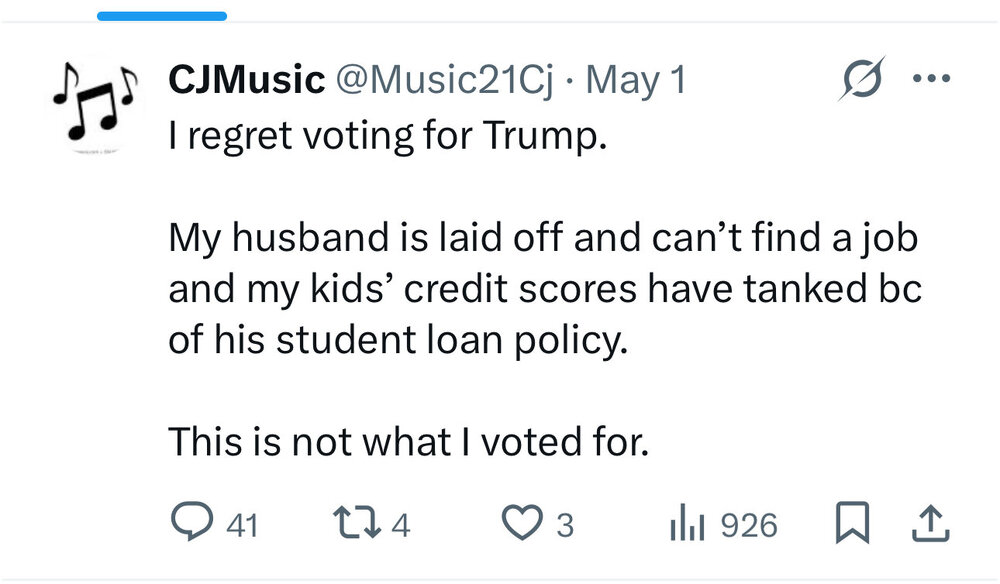 Except for small business owners that sell imported goods. Or truck drivers. Or corporate leaders that are dealing with falling stock prices. Or corporate import specialists that deal with fluid tariff rates. Or the legal professions. Or educators. Or investors. Or outdoorsman. Or farmers. Or manufacturers. Other than that I’m sure they’re extremely happy. -