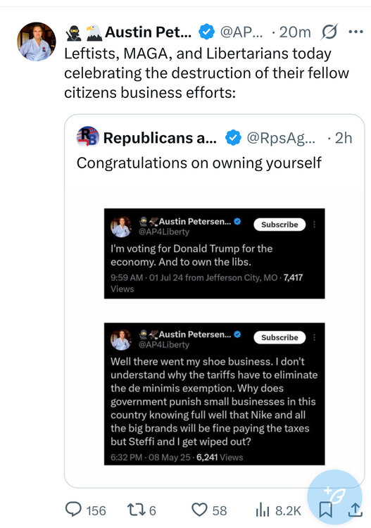 Corporate leaders are having to make significant moves at significant cost due to tariffs with zero confidence their moves will be correct because donnie2dolls is unpredictable. I spoke with our CEO about this a week ago. Farmers care about pronouns and foxnews until tgey buy seed and pesticides. They will hurt. They’re not that stupid. I just attended my nephew’s graduation at ou business college. The president of the college was all about pure unfiltered capitalism. Perhaps the exception but my wife got her MBA at smu, and one of the teachers was in charge of the dallas branch of the fed. I suspect he leans riggt. I’ve been to three smu badketball ganes. W has attended courtside at two of them and got standing ovations at both. Tell me again how educators are exclusively liberal. I never said mostly. Put your strawman away. -