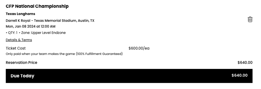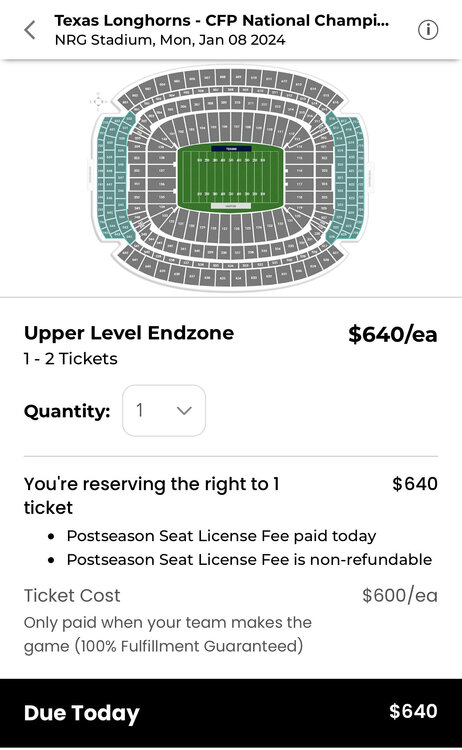 13. Right now those options are at 640 for a face value ticket at $600 putting the total outlay at 1240 for a UT MNC ticket. If you were to buy today, cheapest ticket after fees on secondary market is a bit over 1900. Not hard for me to see a world in which after fees are taken out an Alabama/Washington matchup nets a seller less than 2X face value.