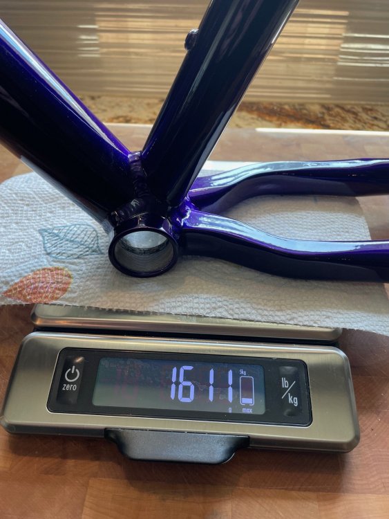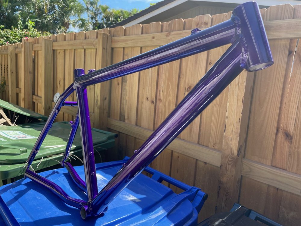 20. Go on.... basted and powder coated (long story).. added 10 grams At the powder coater they didn't have baby blue in stock and none of the colors really jumped out at me, so I asked if they had any wild purple colors... the guys eyes lit up and said they had a custom purple left over and they seemed to think it'd look good. So I just went with that... pictures don't really show the paint, sometimes it looks grape blue, other times iridescent purple, sometimes almost clear/bare metal at the welds (I assume it has some silver flake in it) It also shows fingerprints like a bitch. RIP Junker stealth look. Thinking of having my daughter draw all over it with a white paint marker... and a custom copper headtube badge... we shall see
