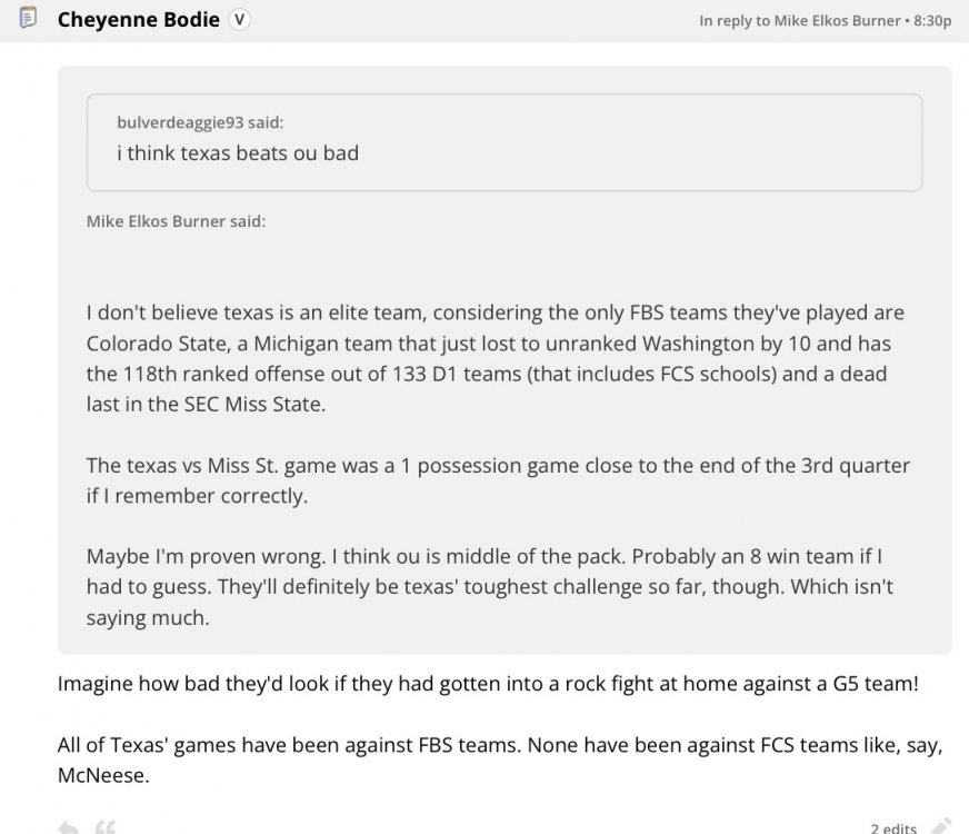 5. An insightful analysis of Texas’ schedule in their Texas-OU thread. Clarifications appear to have been unwelcome.