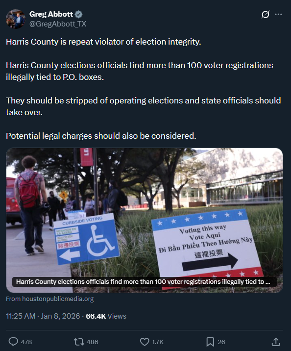 Oh great, Gov Hot Wheels wants the State to take over more stuff in Harris County... https://x.com/GregAbbott_TX/status/2009315542826402053?s=20 100ish voter registrations at P.O. boxes out of 2.7 million registered voters is apparently just cause for State takeover... never mind that if I had to hazard a guess most of those registering/trying to register at a P.O. box are probably Abbott/Trump voters who "don't want the govmit to know where I really live" (spoiler alert, they know where you live, Jethro)