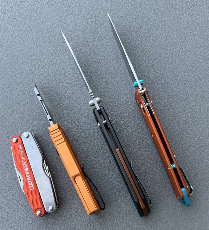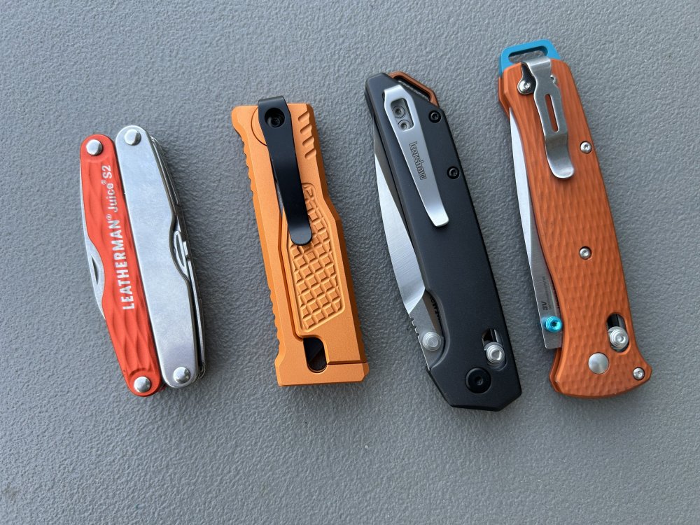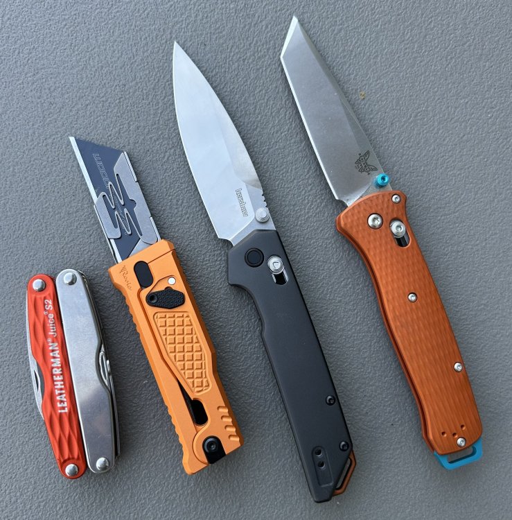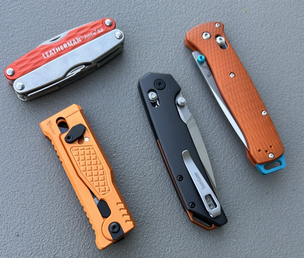 12. I’m always looking for a burnt orange knife in a style I like. Until I fork over the $300 for the latest Sage 5, these will have to do: Benchmade Bailout kershaw Iridium reate box cutter leatherman juice The bailout feels the best but the iridium is pretty good. With the iridium at $50 while the Bailout is $200, it is a better value.