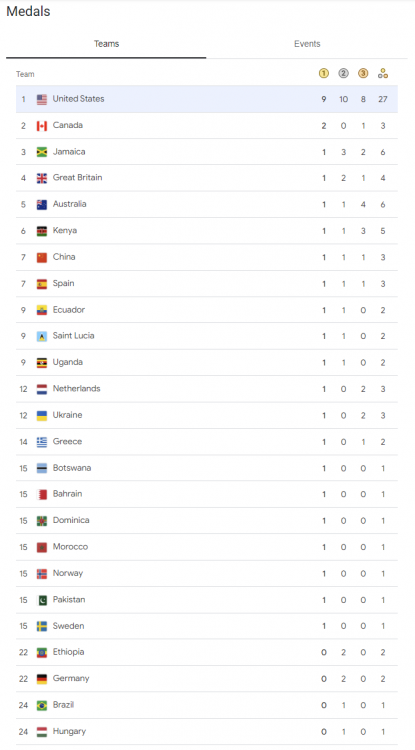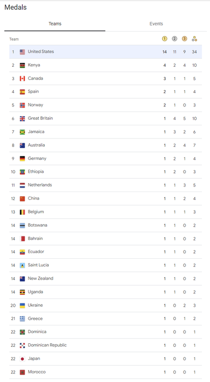 Haha thank you but that is definitely overstated! One pitch I will make to those who generally don't watch track and field outside of the Olympics: consider following them throughout the season and in non-Olympic years in Diamond League competitions and at World Championships (usually every odd year). Their careers are short and the earning potential for most is limited. Worse, US athletes often compete in anonymity and have to go overseas to perform before a crowd despite the US dominating athletics at the pro and collegiate levels. Diamond League competitions are basically a mini track meet--there's typically 15-20 events held in various cities throughout the world every week or two from late spring through early fall. Entry is invitation only with athletes being paid an appearance fee. Not every event has the budget to bring in a full slate of the world's best, so the more eyes watching, the more that budget will grow. Speaking of American domination, here's an updated medals count for track and field events only.