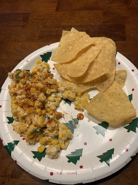 6. Leftover elotes served cold as a dip with some H‑E‑B bakery tortilla chips. Added extra topatio chilli and lime to make it so.