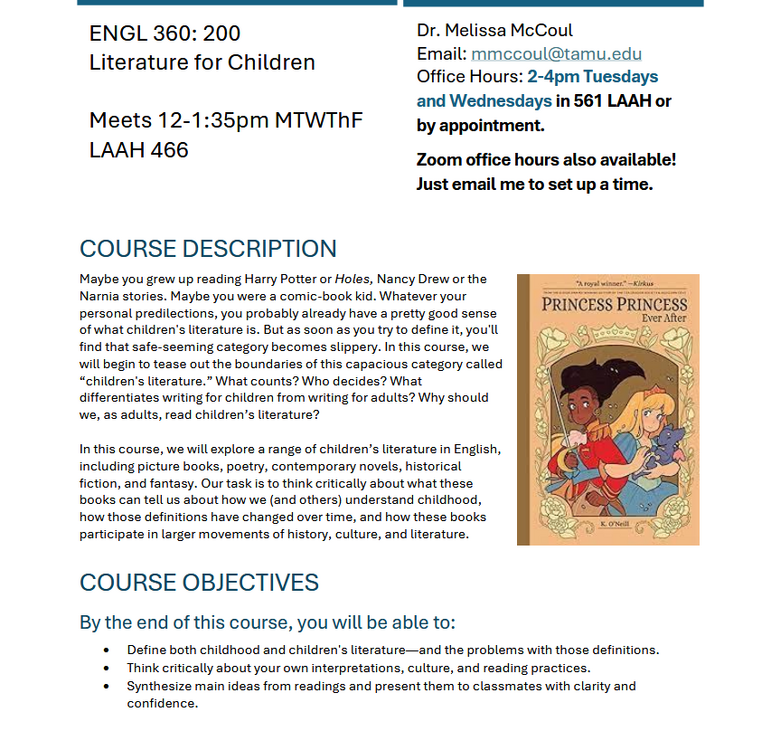 22. From looking at the syllabus for the summer the lecturer did not stray away from the course description either. She did a graduate minor in gender studies and specialized in children's studies. This is a 300 level class where she been teaching it since 2018. The lecturer had good ratings for this class on ratemyprofessor. This whole thing should never happened and the student should have dropped the class instead of going on a witch hunt. This is why a lot of people are not wanting to work in this state and a good chunk of faculty want to leave the state too for higher education.