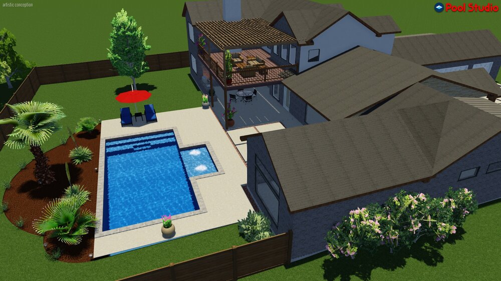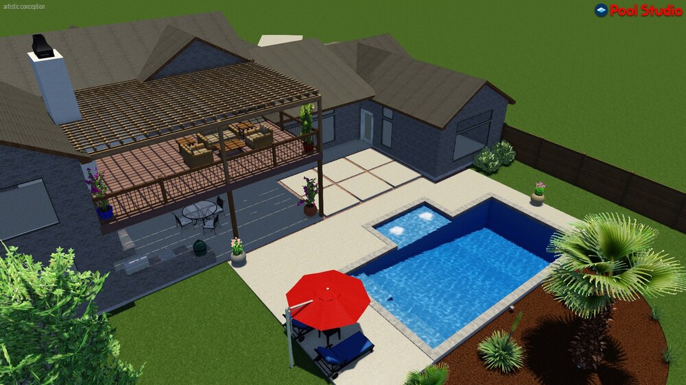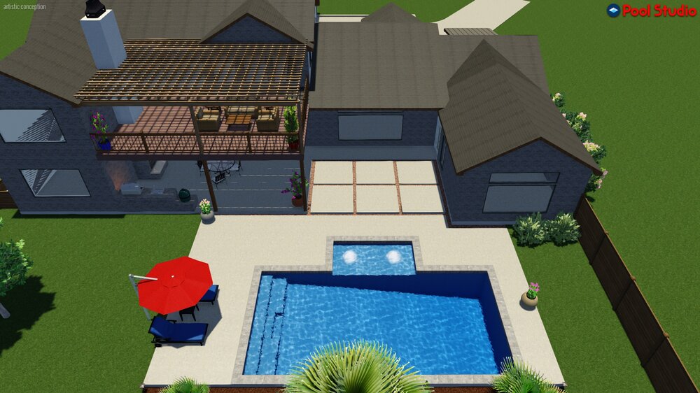 8. Pool designer messed up on the rendering. There is no deck. Just a big outdoor living space with a shed roof that apparently is a double level pergola!