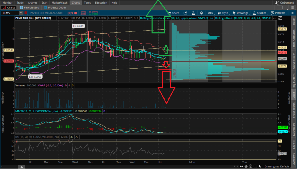 PFMS outlook using Volume profile, we're sitting on top of a lot of support, but looks like if .009 breaks downward there's a lot of stopping power at .007 -. 0075, below that is freefall. Likewise however if we could get a little juice its gappable up to .015 which is why we see it flash upward any time there is buying. .016 clears and we should see a nice gap up and hopefully create some new congestions on the way to support it.