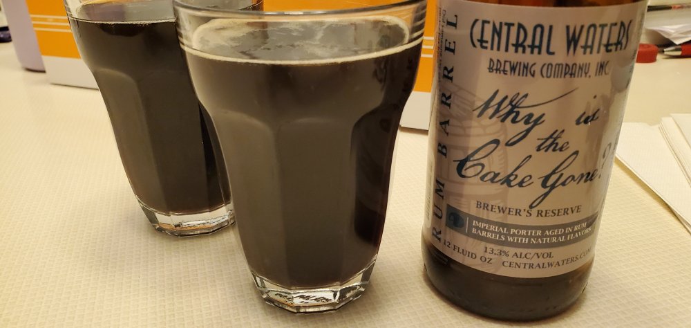 Son's home from the Twin Cities for spring break. Why is the Cake Gone imperial porter aged in rum barrels from Central Waters. Good beer to split -- 13.3 ABV. I've had this one when its been north of 14, too. -