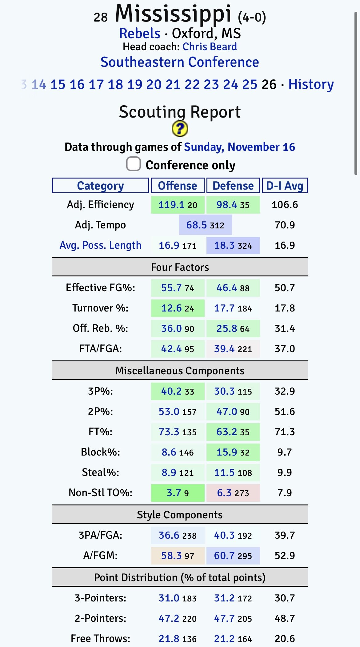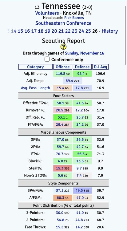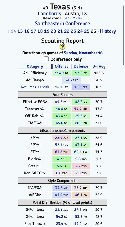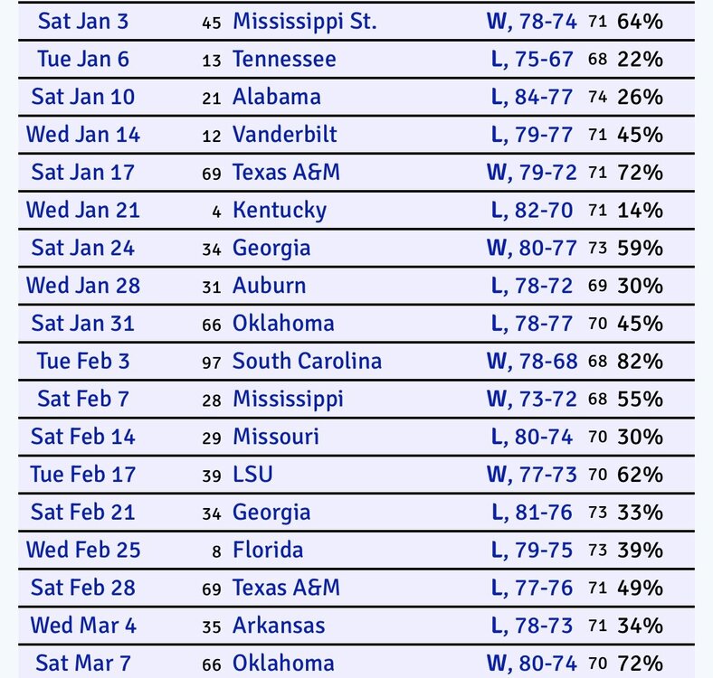 so it shows 7 projected wins on the conference slate, but kenpom’s actual projected conference w/l is 8-12 because he’s got some stuff added into his equations to take into account that his predicted outcomes won’t always hit. so you see the vandy and ou losses at 45% chance to win and the a&m loss as a 49% chance to win, and between those three projected losses is probably where you get that 8th projected win.