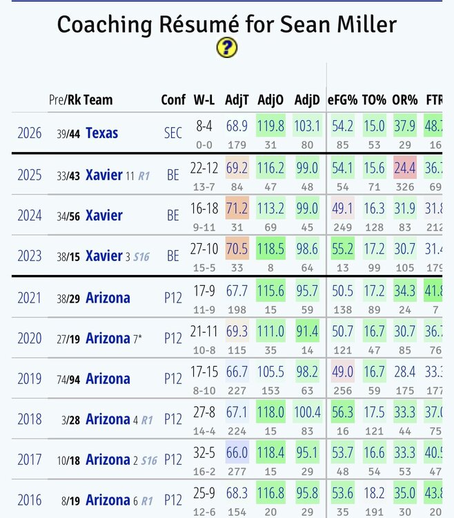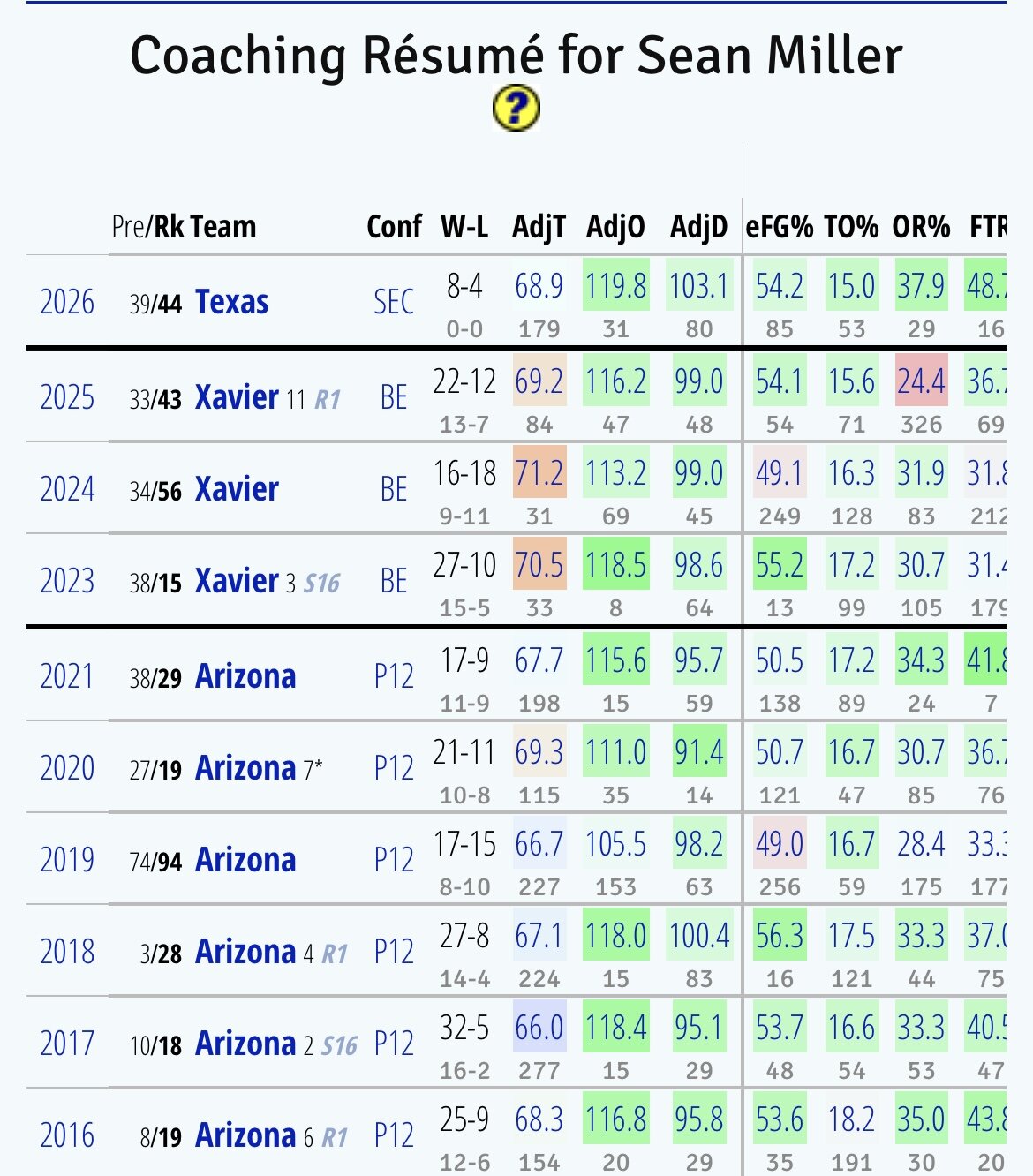 as has been posted here many times, sean miller hasn’t really done shit in the last 10 years. his only good teams came more than a decade ago when he was cheating his ass off, and he showed even more obvious character issues with the way that he immediately ditched Xavier for the Texas job after Xavier had welcomed him back home with a soft landing spot and open arms after his fbi/cheating scandal at arizona. the guy looked like a star 10 years ago, but that’s eons ago in the world of college basketball. since then, his resume is “meh”.