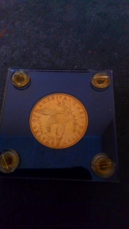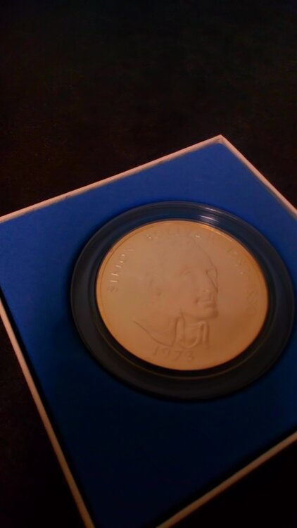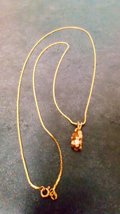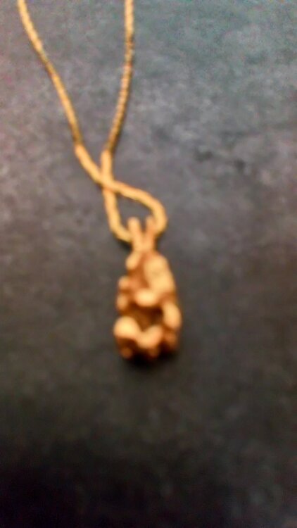 3. I think it is a 20 Balboa, from 1973. Wouldn't buy any numismatic type coins today. Bid/Ask is a nightmare unless you are holding for a long time and a big swing in price in your favor. If holding constant or goes against you due to bad timing, the bid/ask totally fucks you and then there is the storage costs.(just rented a box for $168 a year but it is for mortgage docs, titles, etc as well as the few valuables and jewelry) My mom, back in the 80's, an art major from way back, melted down a Krugerrand and a diamond ring and made this(she wore it with that chain, the backside pic is extra blurry ) Not sure she used a total oz of gold or what. Haven't had it weighed or anything. Kind of sentimental value since she made it(not the chain of course, just the simulated nugget design w/diamond).