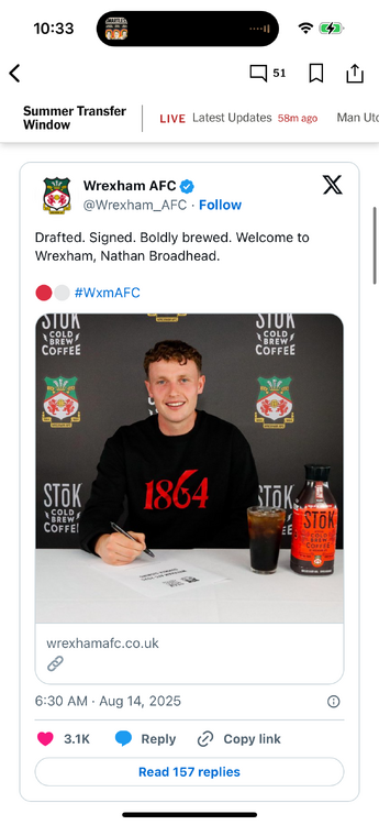 8. A huge piece for the push to be contenders: https://www.nytimes.com/athletic/6553621/2025/08/14/wrexham-nathan-broadhead-club-record-transfer-ipswich/?source=user_shared_article Wrexham sign Nathan Broadhead for club-record fee from Ipswich Town