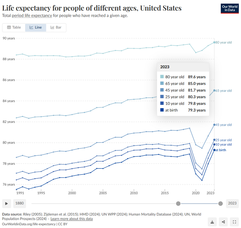 8. Baked into infant life expectancy numbers are non-health factors, like behavioral (risk taking / accidents), suicide, homicide, etc. So if you make it to 65 past the gauntlet -- you havent been killed in a DUI, or liver cirrhosis from watching too many UT games -- you "gain" 5+ years of expectancy.