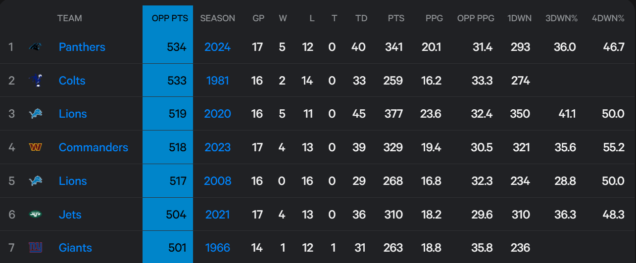There were at 473 total points given up coming into this game, now at 507. That puts them at 6th all time worst. I think the Bengals loss today was already factored in.