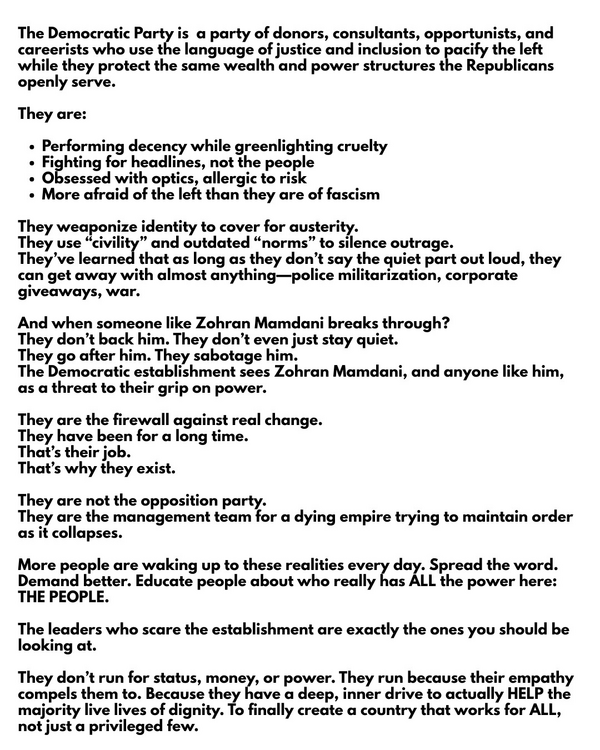 I'm interested in y'all's comments on this? How widespread is this sentiment in your opinions? How large a part of it is responsible for the disconnect between the working class and the party? Frankly at the heart of democracy is disagreement on many levels, but that works to move things along slowly towards a better society. But I personally feel the scam of superdelegates to put Hillary in over Bernie was the point where people started shaping up this idea and reinforcing it with example after example.