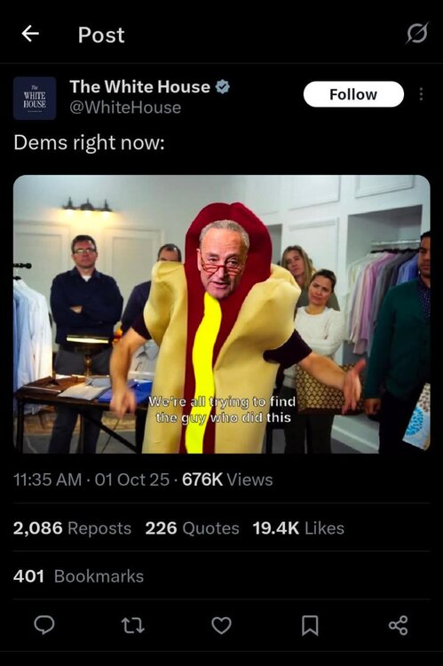 14. I think I'm misunderstanding the "Dems should stand back and let them destroy themselve" argument. I thought that would be to let the Republican policies go forward, by them implementing the R budget, R cuts, etc and continuing to fund the government as the systems implode on for everyone to see. That would mean some Dems voting for a CR to re-open the government. I'm not sure how the right winger common people would realize "how the new law completely turbofucks" them if the government is shut down otherwise.