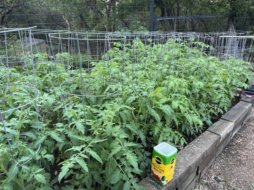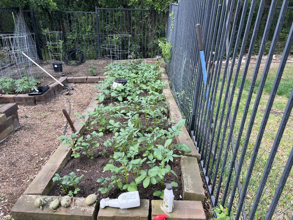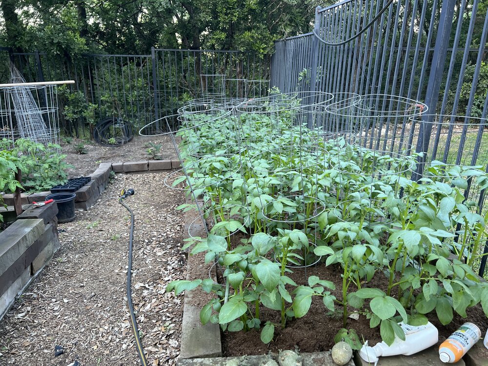 3. Miracle Gro once a week You need to plant bigger tomatoes much sooner. Once the lows are in the upper 70s-80s the flowers wont set fruit. You’ll have to hope for a cool June. Suggestion for next year. In February Buy tomatoes in 6 or 9 packs (cheap) then up pot them in DEEP plastic 4 inch pots (not easy to find), keep them in trays to be able bring in on cold nights. Use Miracle Gro for tomatoes frequently. You can use a dilute solution almost daily. Around March 10th, go for it. Plant deep in the ground with a little compost and slow release fertilizer. The pic above is 2 nine packs @$6.99 Lowes, got lucky, not a fan of their prices 9 singles @$1.49 HEB huge fan of their veggies and prices 3 tomatoes are from last year! See post on previous page, cut back and growing again $9 for seed potatoes